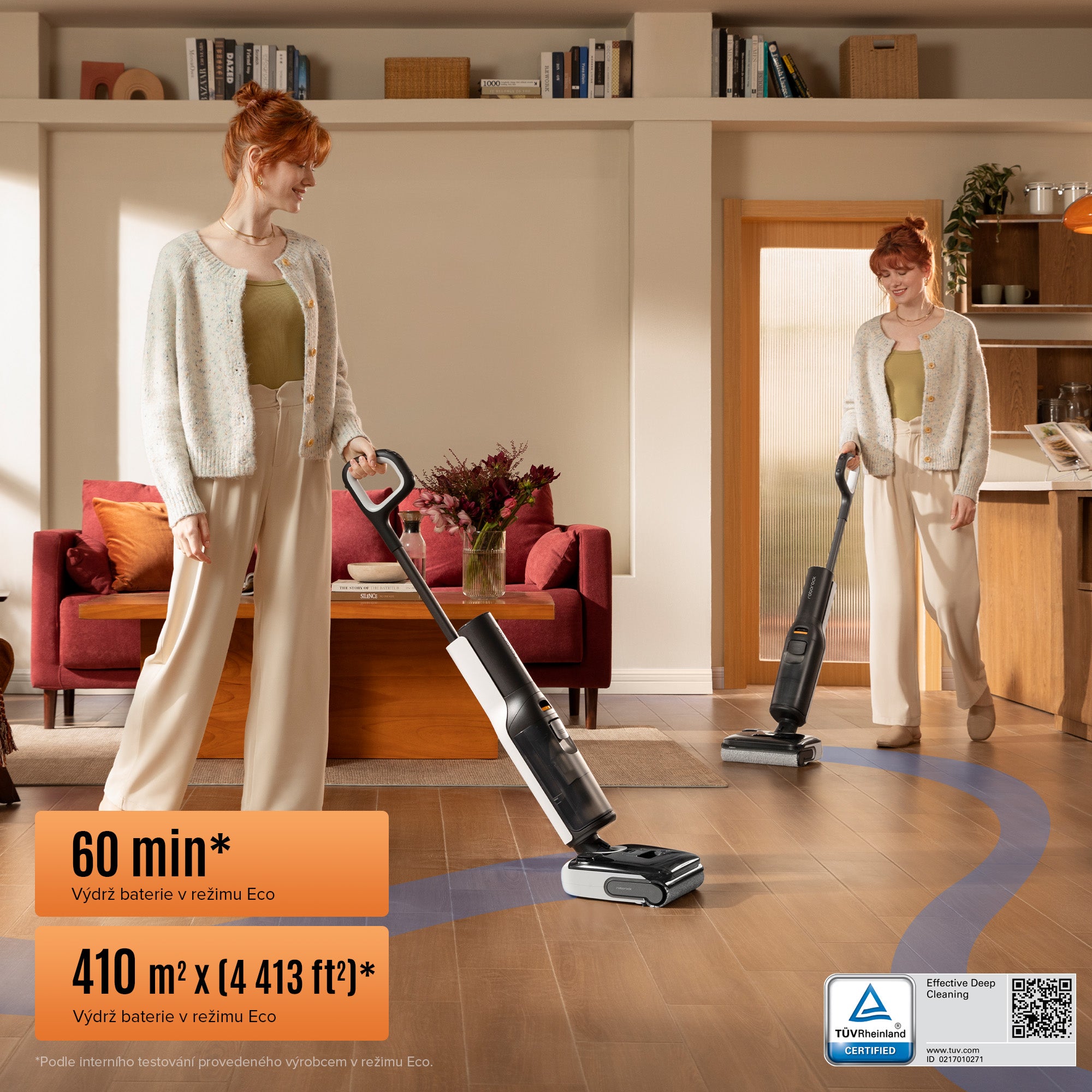 Díky výdrži baterie 60 minut v režimu Eco je možné na jedno nabití bez přerušení vysát až 410 m2 (4 413 stop čtverečních).3
