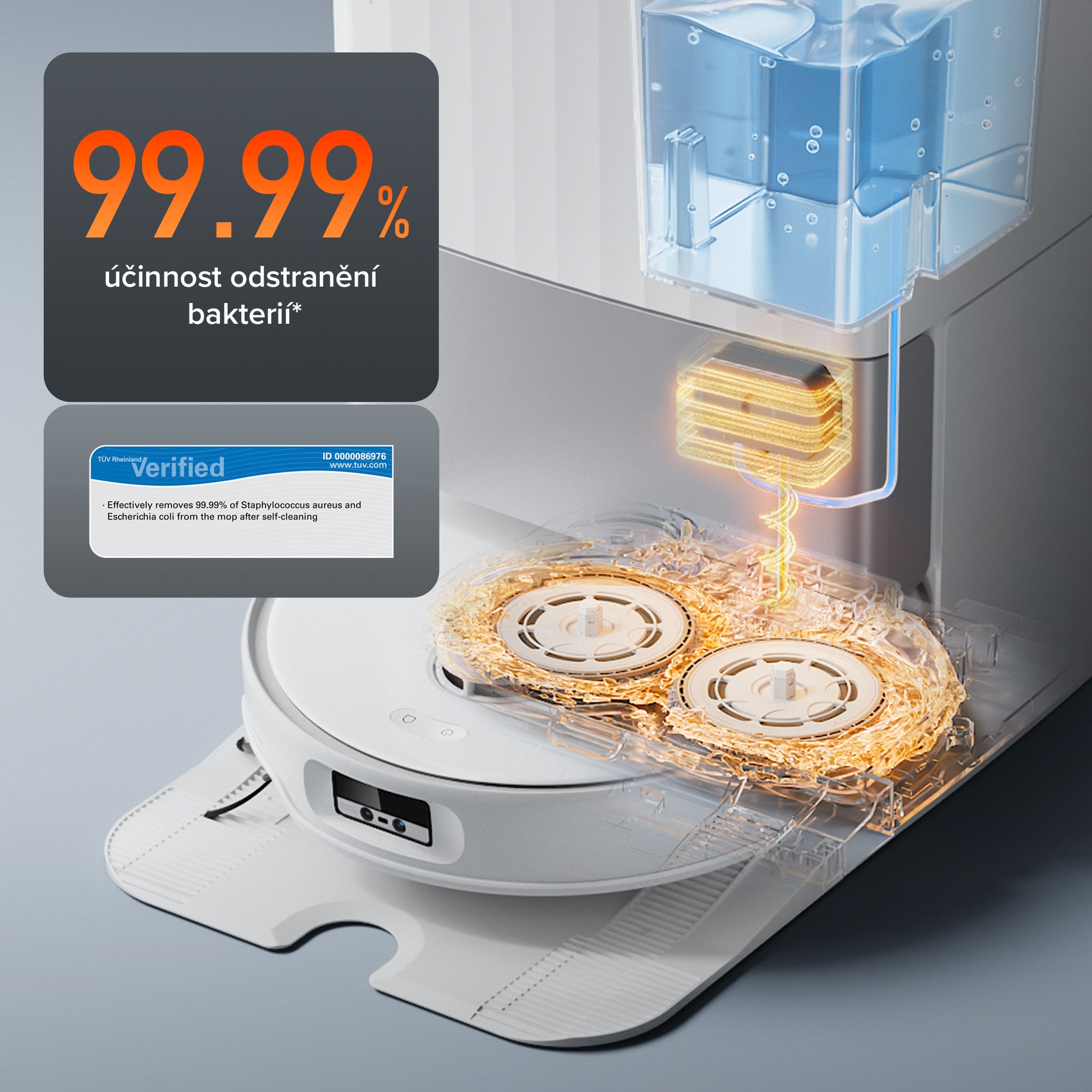 Mop a základna dokovací stanice jsou do sucha vysušeny teplým vzduchem (45 °C)*, což zabraňuje vzniku plísní a nepříjemných pachů.*Na základě interních testů provedených výrobcem lze vzduch na výstupu ze základny během sušení ohřát až na 45 °C při běžné pokojové teplotě. Skutečná teplota se může lišit v závislosti na okolním prostředí.