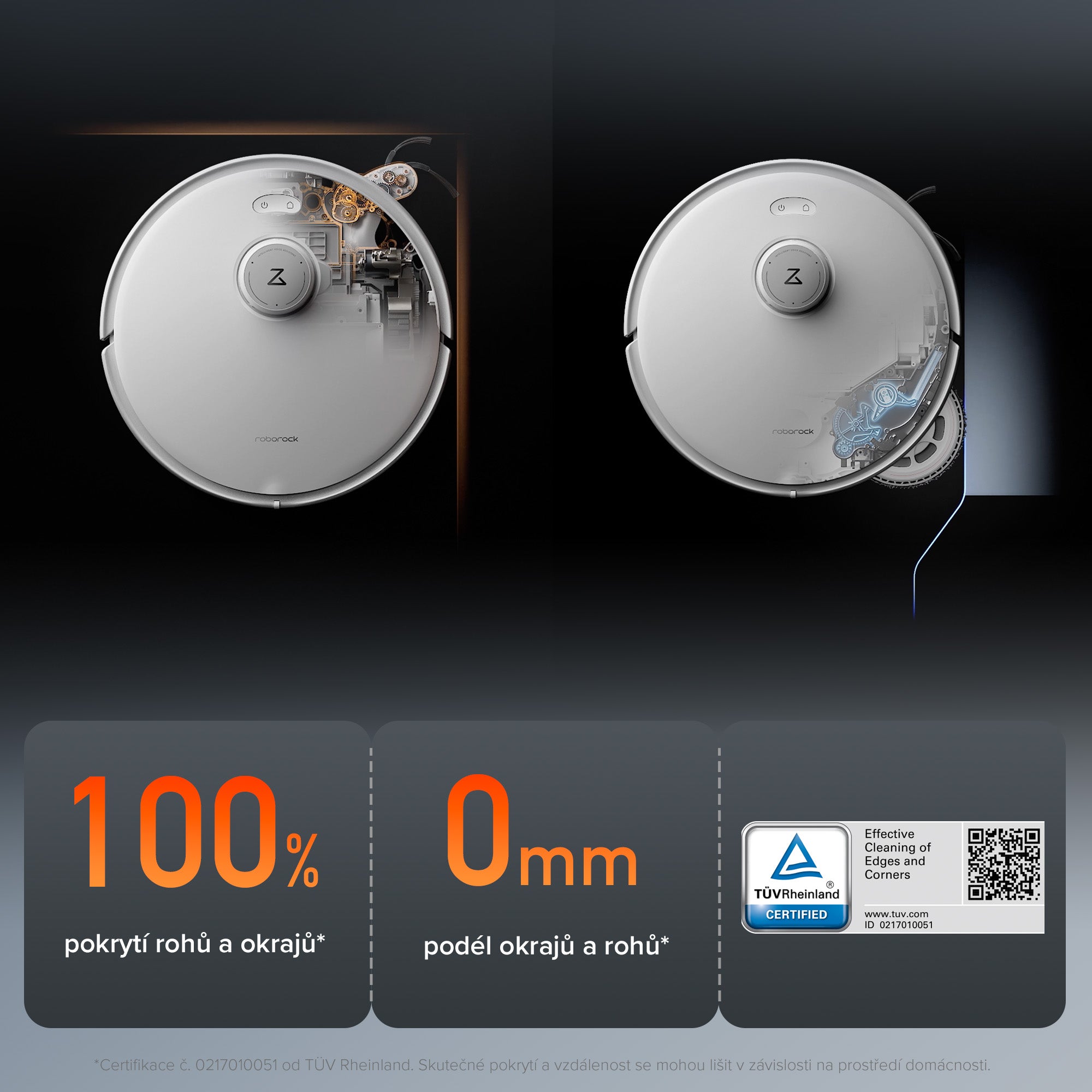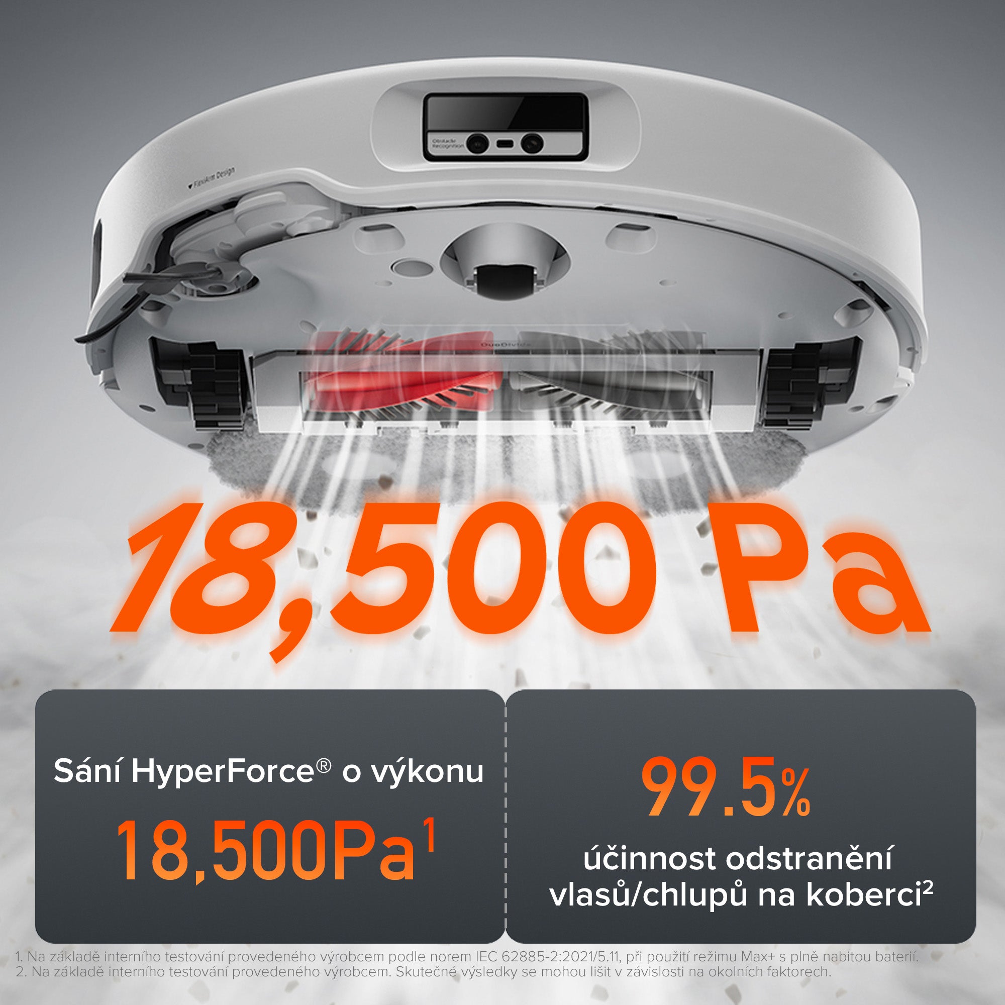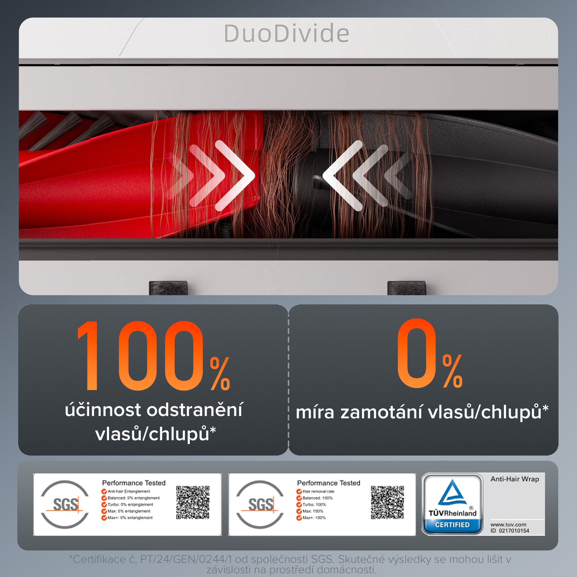 Robot je vybaven dvěma paralelními válečky s krátkými štětinami a spirálovými čepelemi, aby kartáč DuoDivide účinně odváděl vlasy/chlupy k centrálnímu vstupu do prachového zásobníku, kde je výkonné sání rychle odebere. Tento kartáč má certifikace SGS and TÜV a nabízí bezkonkurenční čisticí výkon a špičkovou technologii bránící zamotávání vlasů/chlupů, čímž nastavuje nový standard pro snadný úklid.