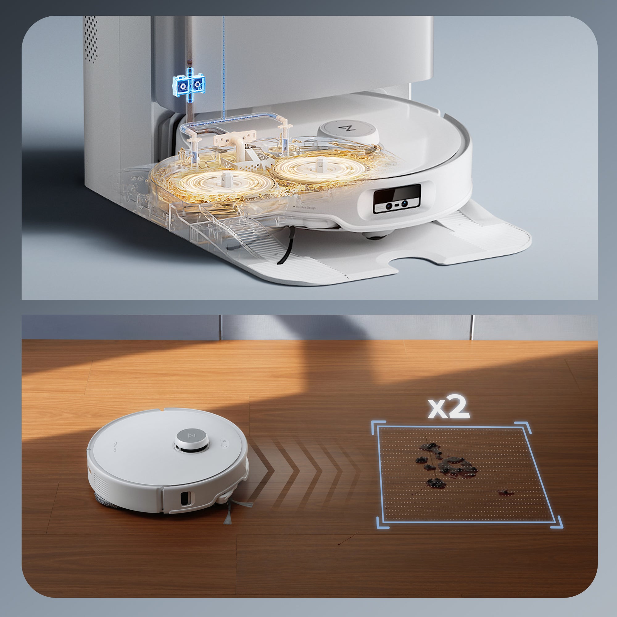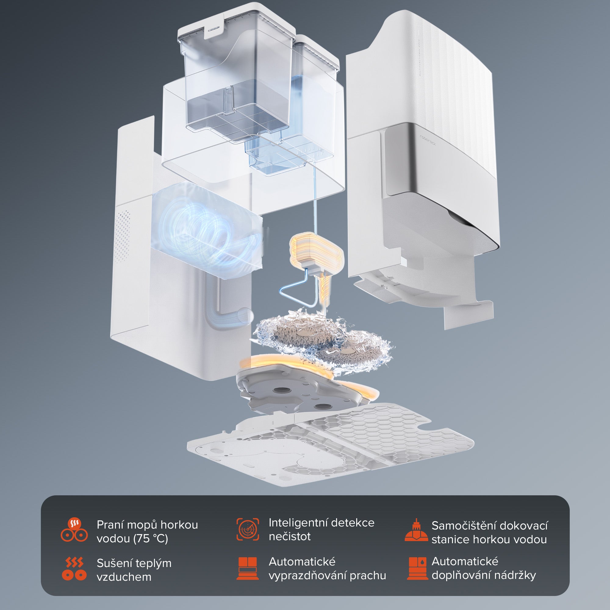 Vylepšená multifunkční dokovací stanice 3.0 je vybavena funkcí praní mopu horkou vodou (75 °C) a samočištění, což zaručuje bezstarostný a automatizovaný úklid s vyšším výkonem a inteligencí.