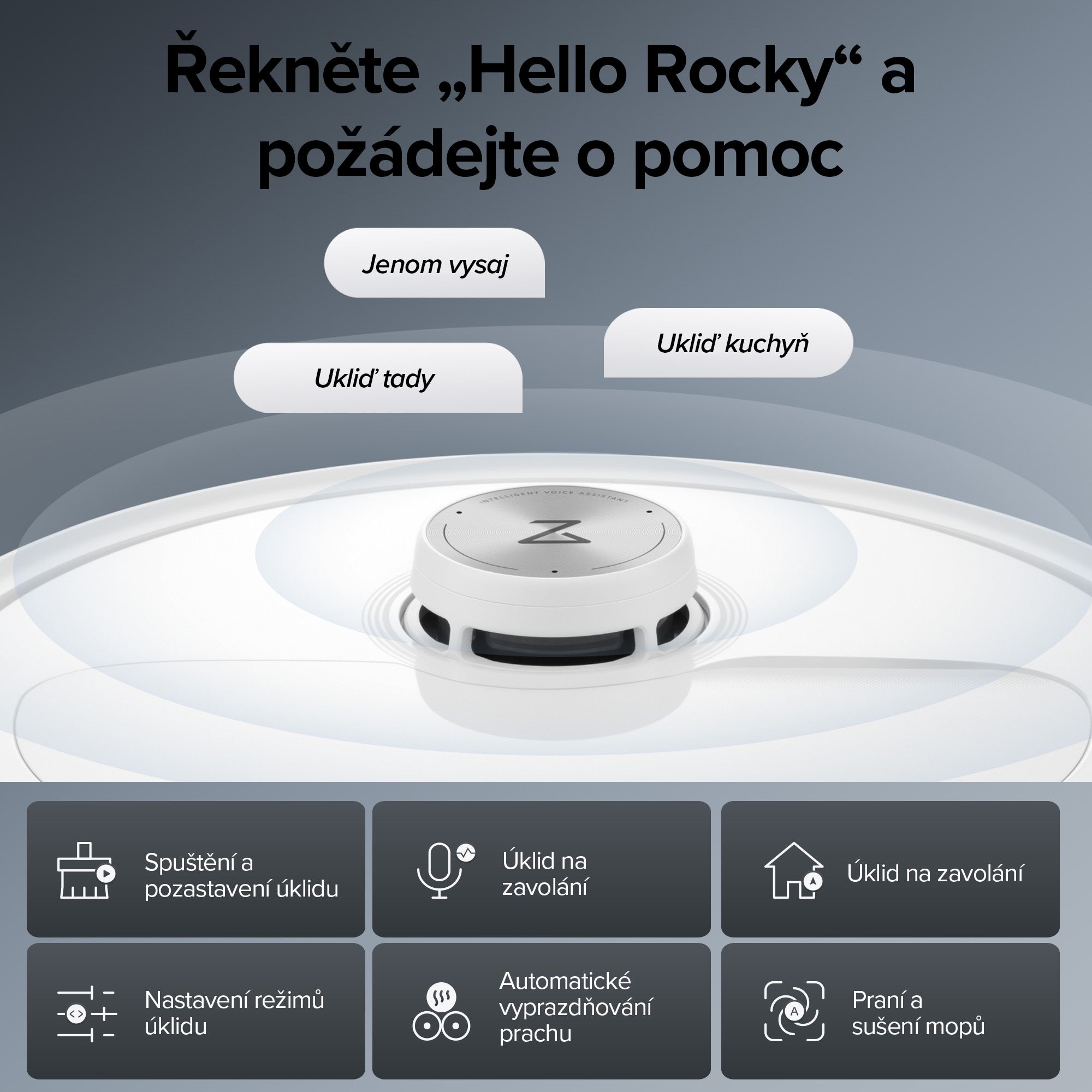 Stačí říct „Hello Rocky“, když potřebujete zahájit úklid, upravit nastavení pro různé scénáře nebo přivolat robota tam, kde je potřeba, a to vše bez hnutí prstem. Dopřejte si pohodlí hlasového ovládání, aniž byste potřebovali WiFi nebo telefon, a to i v režimu offline.*Povely uvedené na tomto obrázku slouží pouze jako příklady. Skutečná funkčnost se může lišit v závislosti na podmínkách používání.