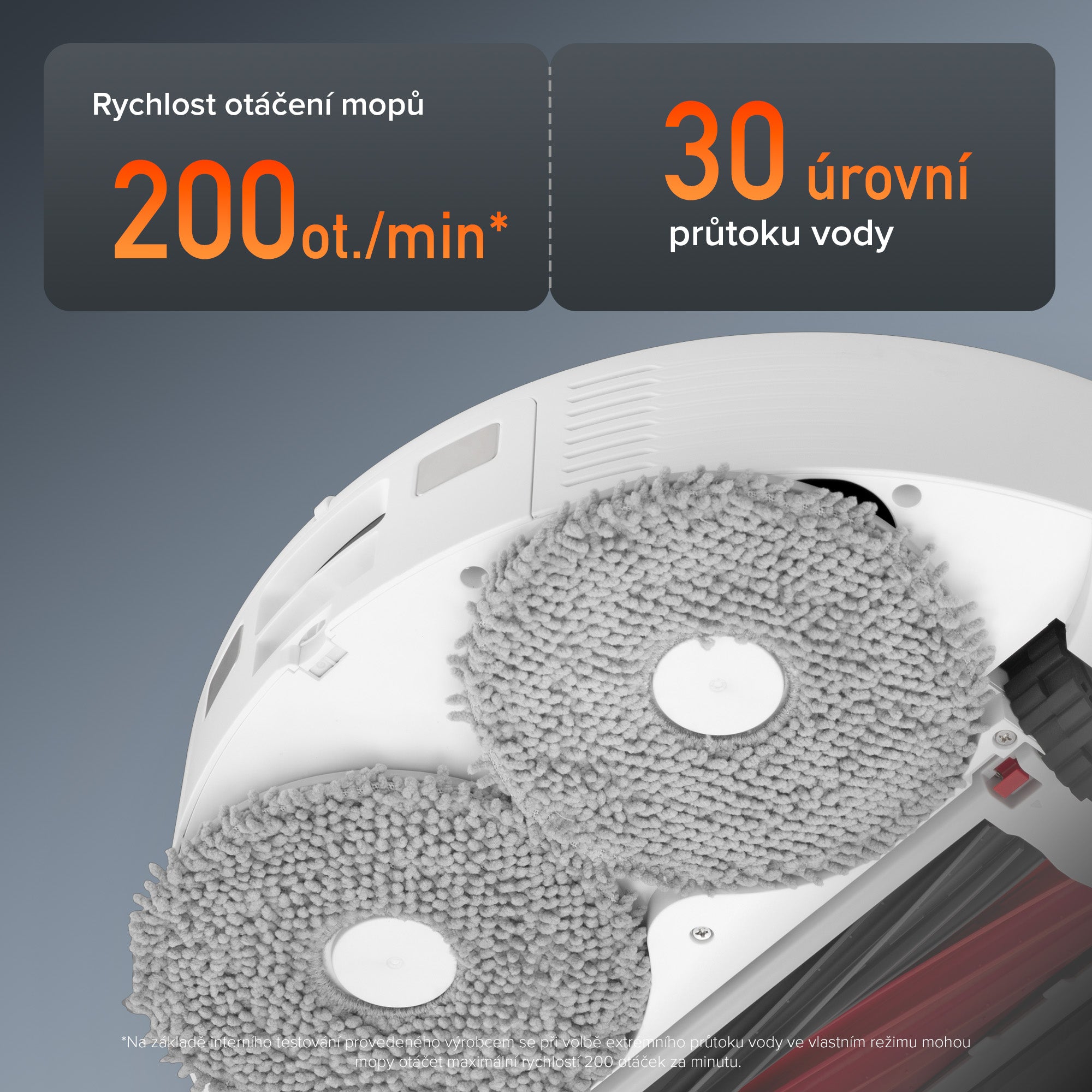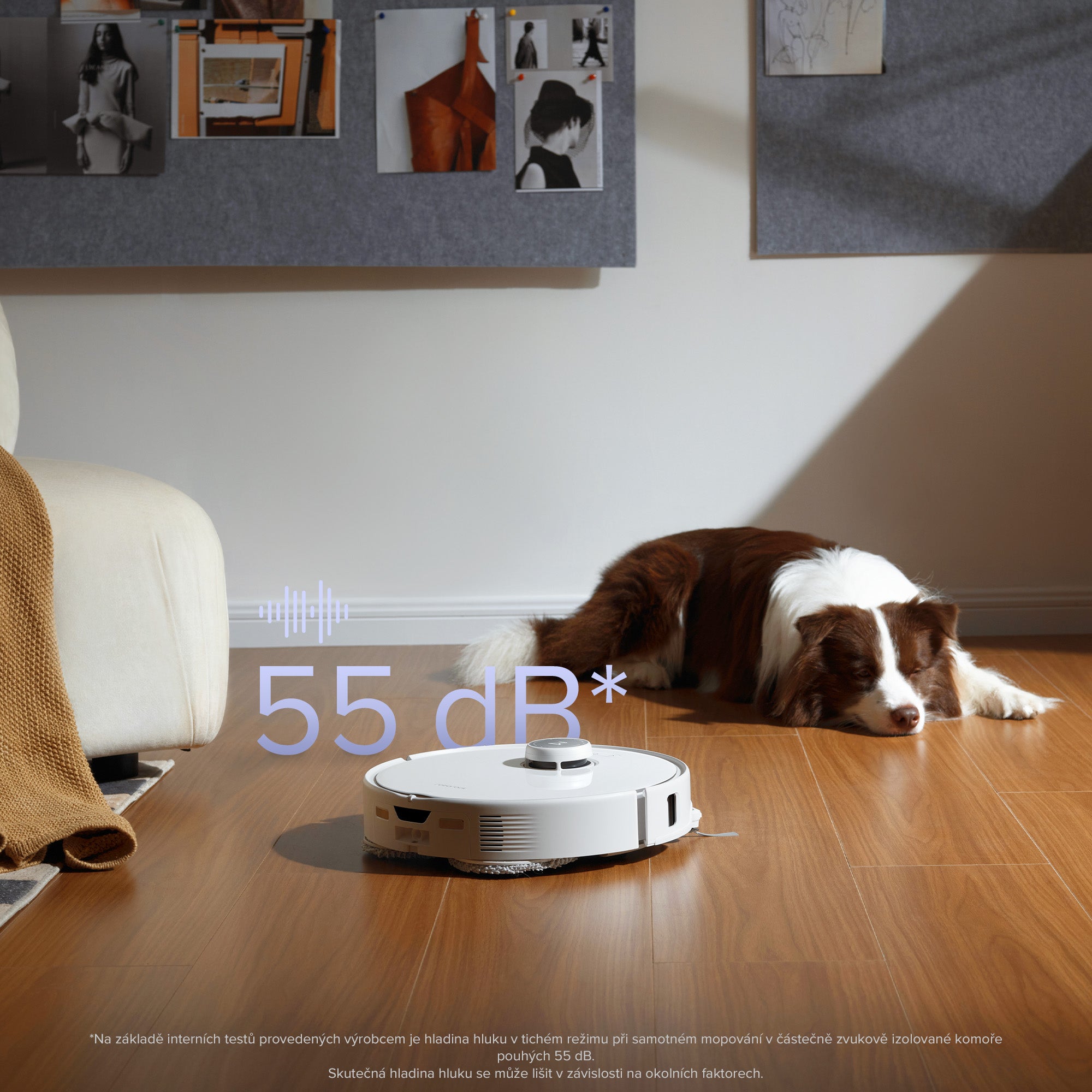 *Na základě interních testů provedených výrobcem je hladina hluku v tichém režimu při samotném mopování v částečně zvukově izolované komoře pouhých 55 dB. Skutečná hladina hluku se může lišit v závislosti na okolních faktorech.