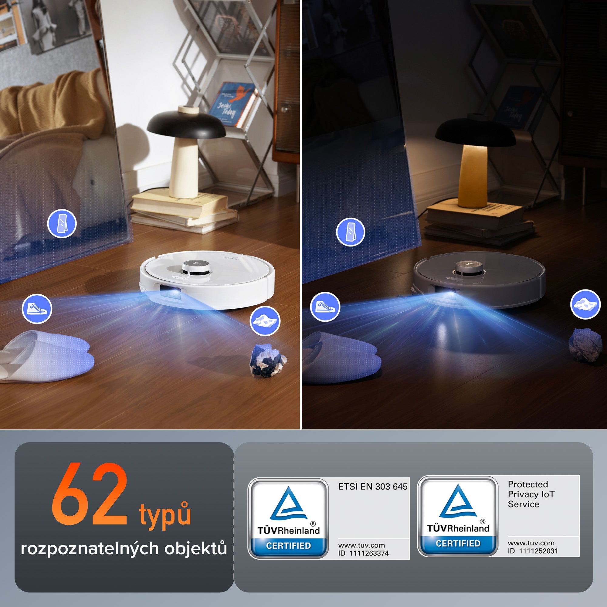 Robot vybavený technologií strukturovaného světla a kamerou RGB umí detekovat a vyhnout se 62 typům předmětů, které spadají do 20 kategorií*. Efektivně se pohybuje kolem překážek a snižuje potřebu ruční manipulace jak za světla, tak i za šera.*Na základě interních testů provedených výrobcem umí robotický vysavač rozpoznat a vyhnout se předmětům již od šířky 5 cm a výšky 3 cm. Přesnost rozpoznávání se může lišit v závislosti na okolních faktorech.
