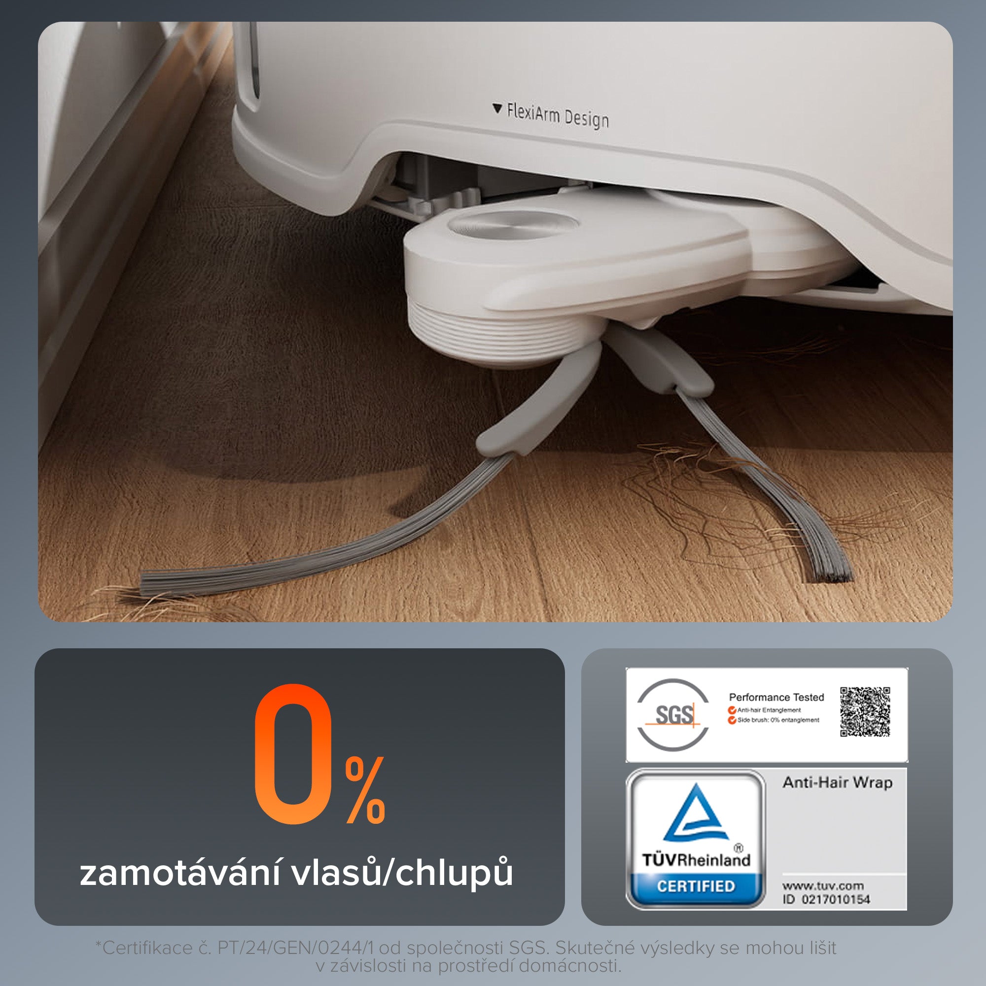 Inovativní asymetrický kartáč ve tvaru oblouku vytváří při rotaci odstředivou sílu, která odvádí vlasy/chlupy ke koncům štětin a zabraňuje jejich zamotávání.Tato konstrukce, certifikovaná společnostmi SGS a TÜV, zajišťuje bezproblémový úklid bez zamotávání při každé jízdě.