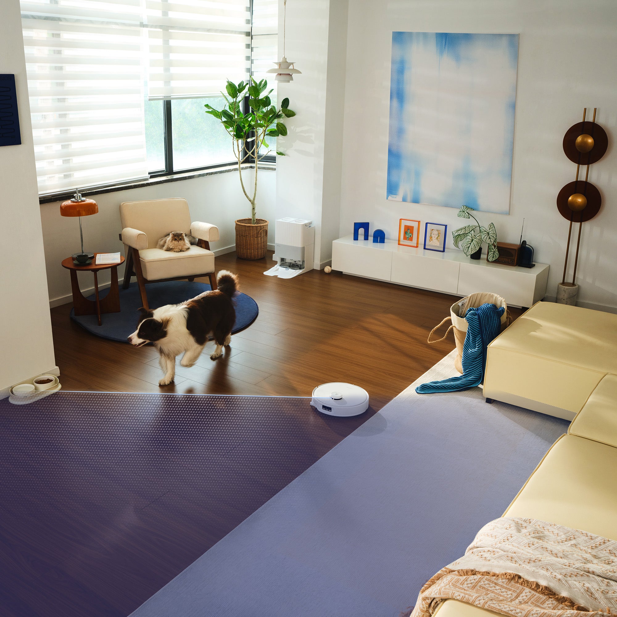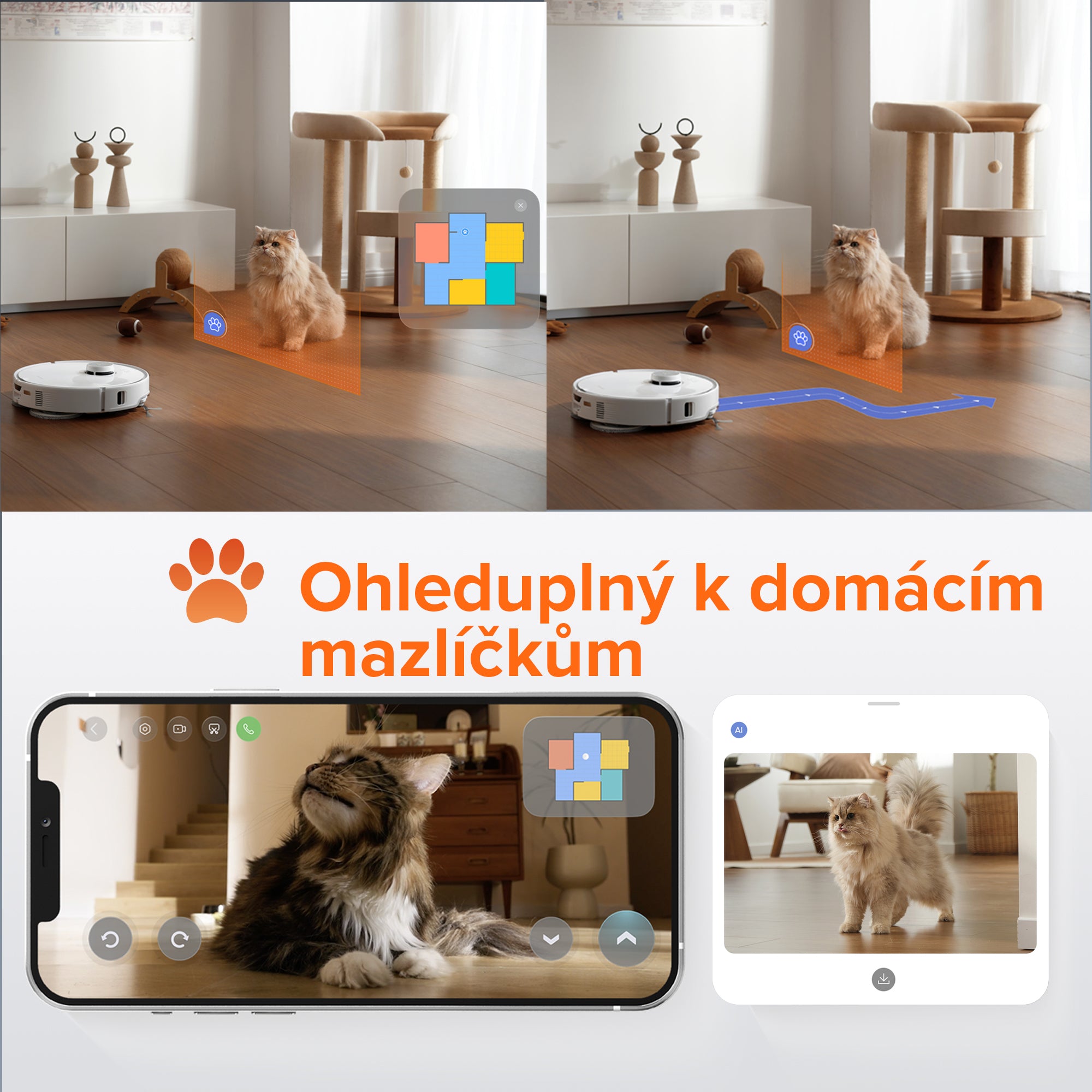 Videohovory v reálném čase a obousměrná hlasová interakce vám umožní „mluvit“ s vašimi mazlíčky jedinečným způsobem. Když se robot přiblíží ke koťatům nebo štěňatům, okamžitě zastaví hlavní kartáč a s předstihem uhne stranou, aby vaše milovaná zvířátka nevyplašil. Robot dokáže během úklidu pořizovat roztomilé snímky vašich chlupatých přátel, které si můžete snadno stáhnout. Umí také automaticky vyhledávat domácí mazlíčky a najít místo, kde jsou schovaní. Můžete také kontrolovat polohu a stav svého mazlíčka, když jste pryč.