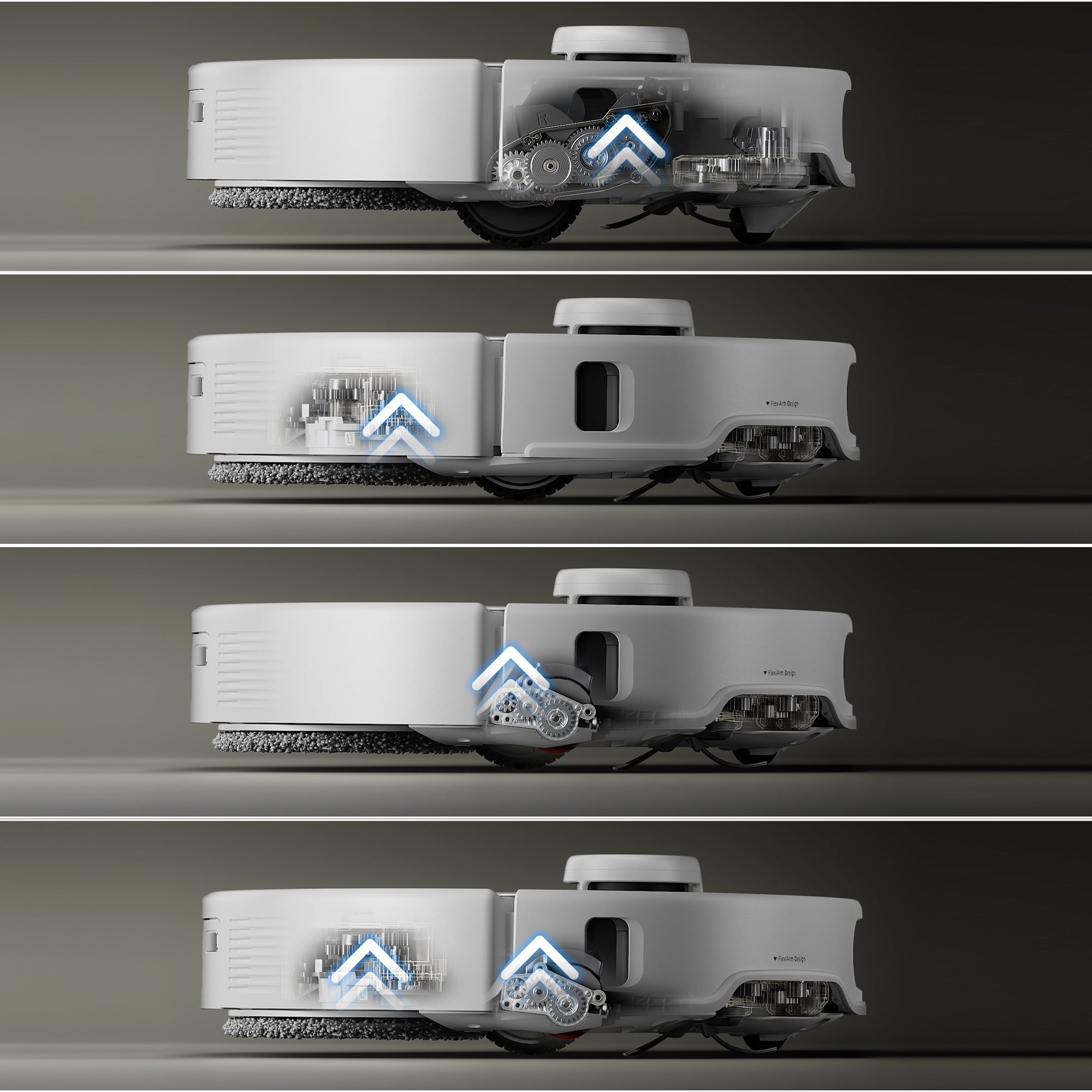 Kartáč a mopy lze v různých situacích úklidu automaticky zvedat, aby se maximalizovala účinnost čištění a nedocházelo k zanechávání skvrn po úklidu.