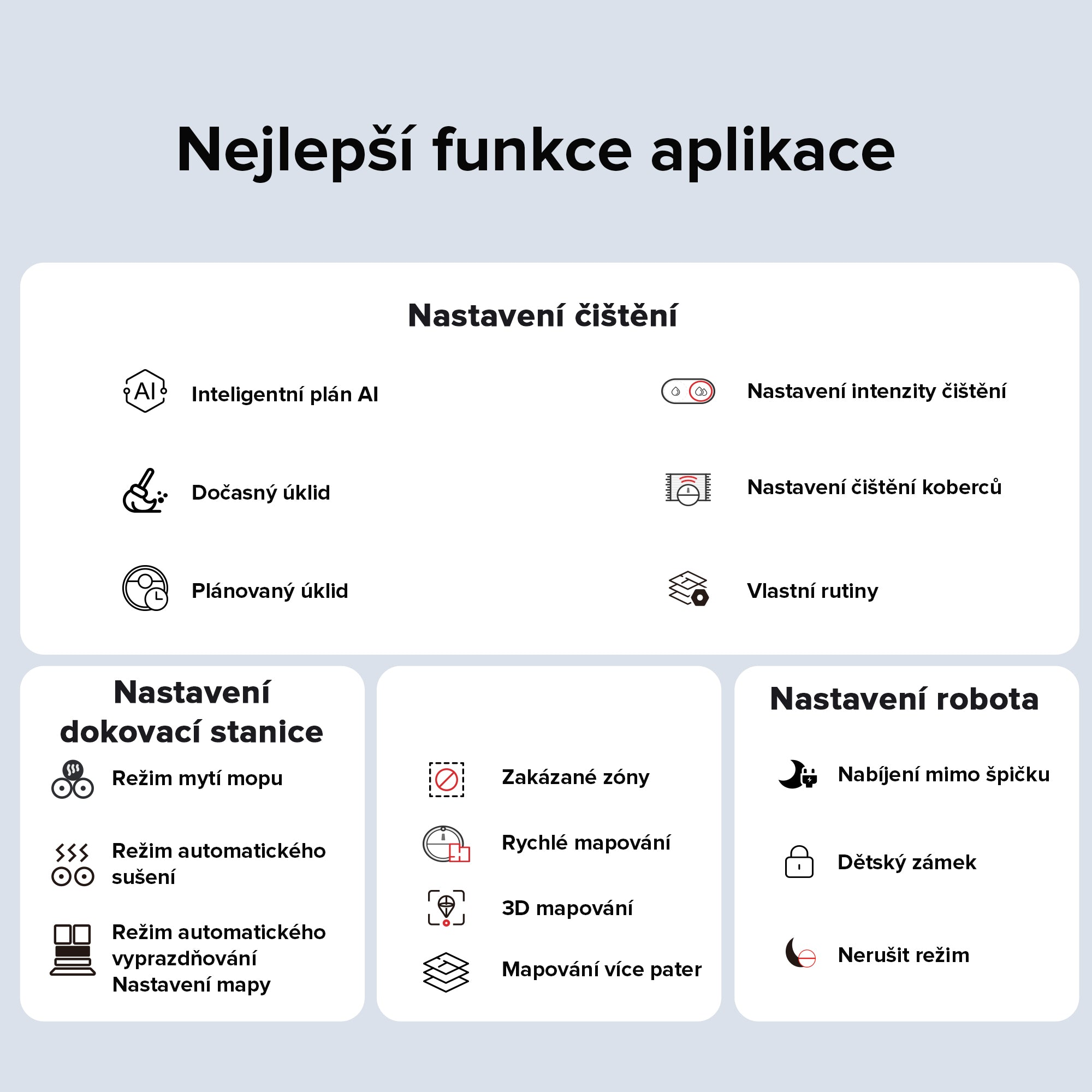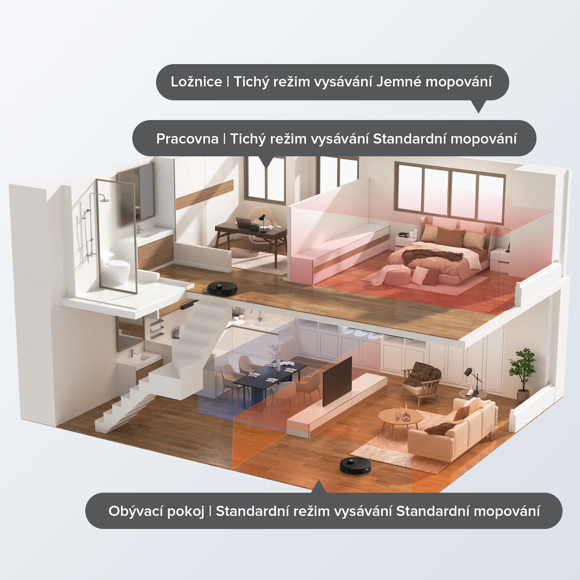 Funkce „Dočasný úklid“ je záchranou při těchto neočekávaných únicích. Rychle se postará o nepořádek, aniž by narušil váš aktuální plán úklidu. Funkce „dočasného přeskočení“ navíc umožňuje dočasně obejít konkrétní oblasti, které v danou chvíli nechcete uklízet.