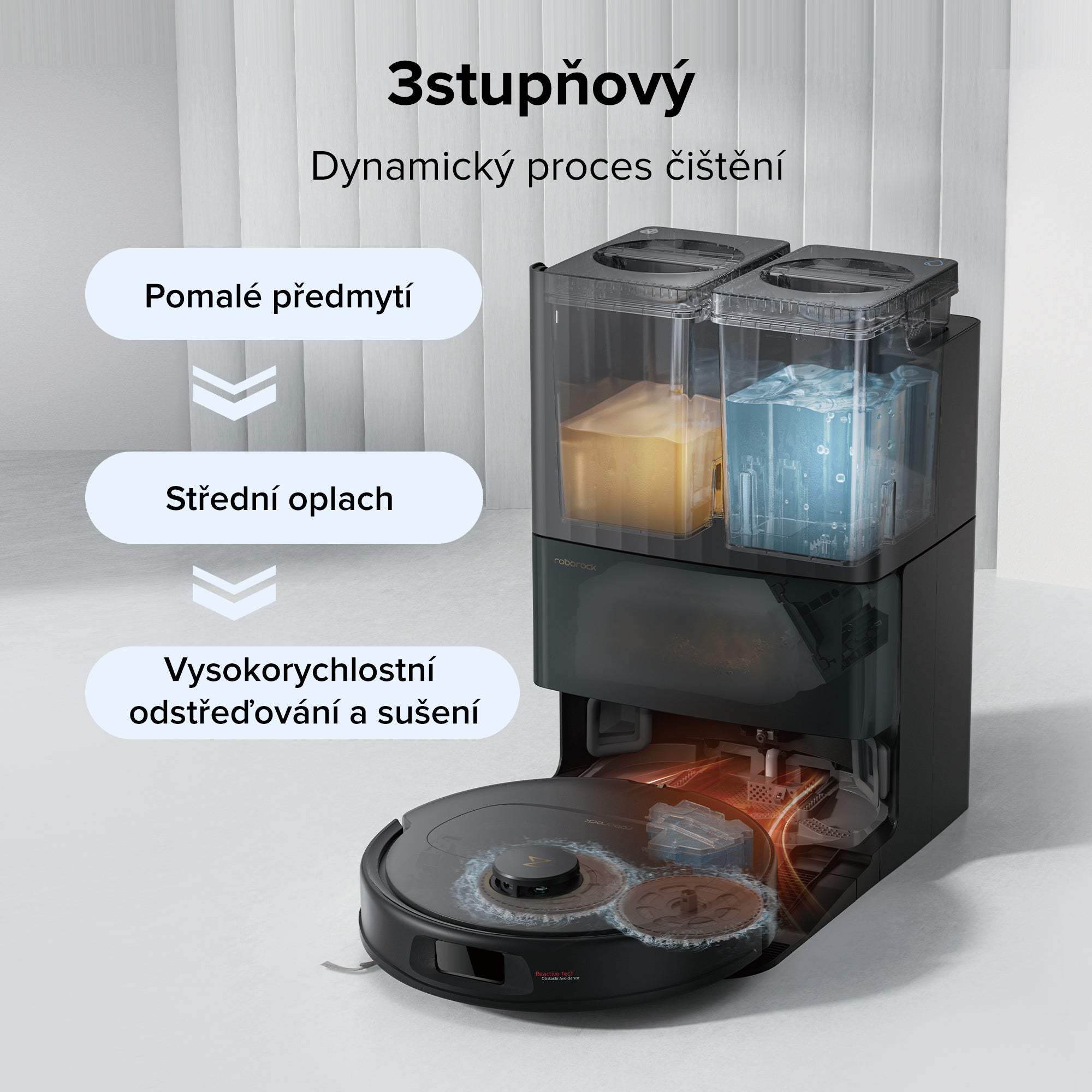 Multifunkční dokovací stanice čerpá inspiraci z procesu čištění pračky a nabízí komplexní zážitek z mopu. Zahrnuje pomalé předpírání, střední máchání a vysokorychlostní odstřeďování. Navíc dynamicky upravuje rychlost a průtok vody pro maximální účinnost a pohodlí.