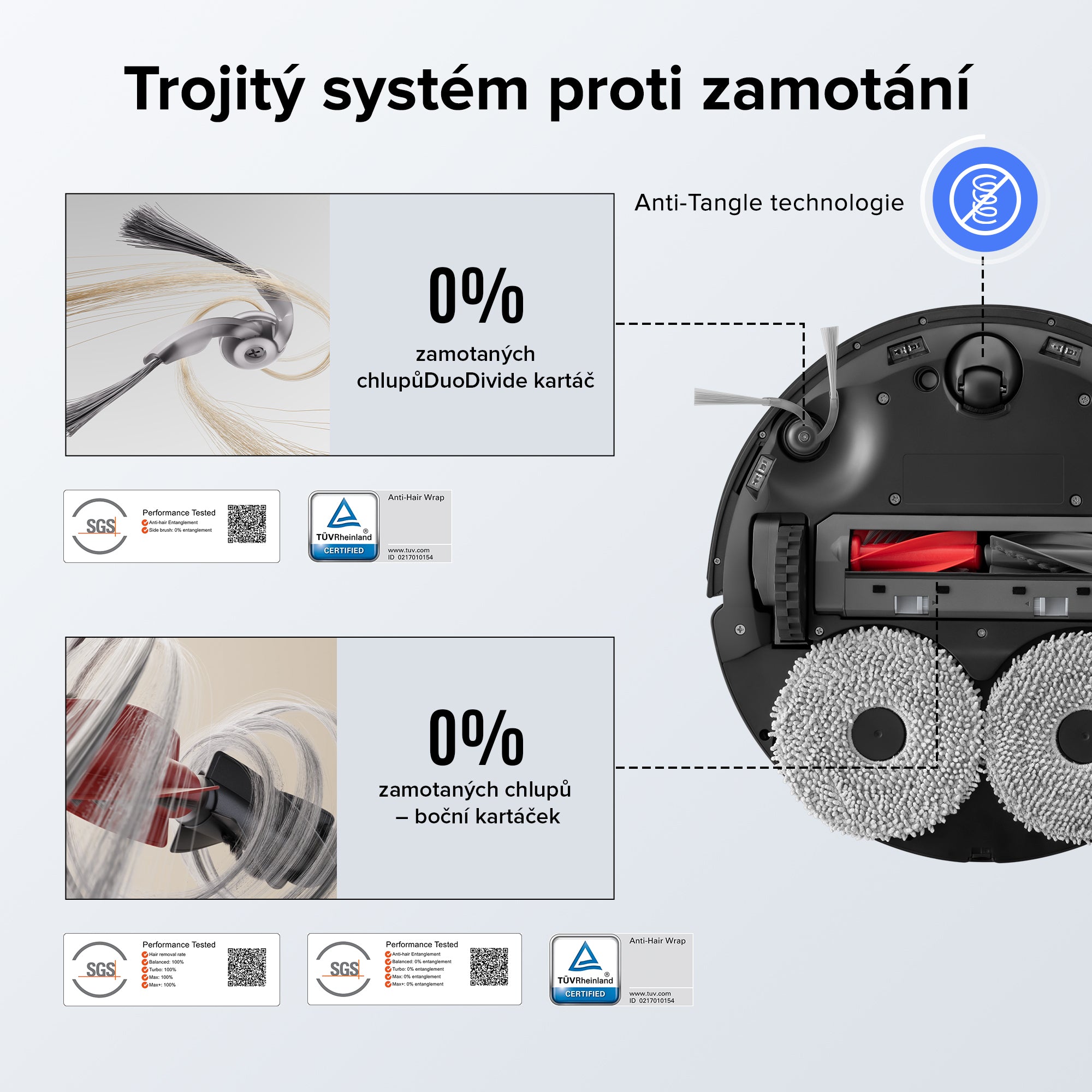 Odpověď: Odpověď: Qrevo S5V má kartáč DuoDivide. Kartáč DuoDivide je certifikován společností SGS s 0% mírou zamotání vlasů a 100% mírou odstranění chloupků. Řeší problém snížené účinnosti čištění způsobené zamotanými vlasy na hlavním kartáči a snižuje riziko poškození hlavního kartáče v důsledku zamotání vlasů, čímž prodlužuje životnost robotického vysavače.