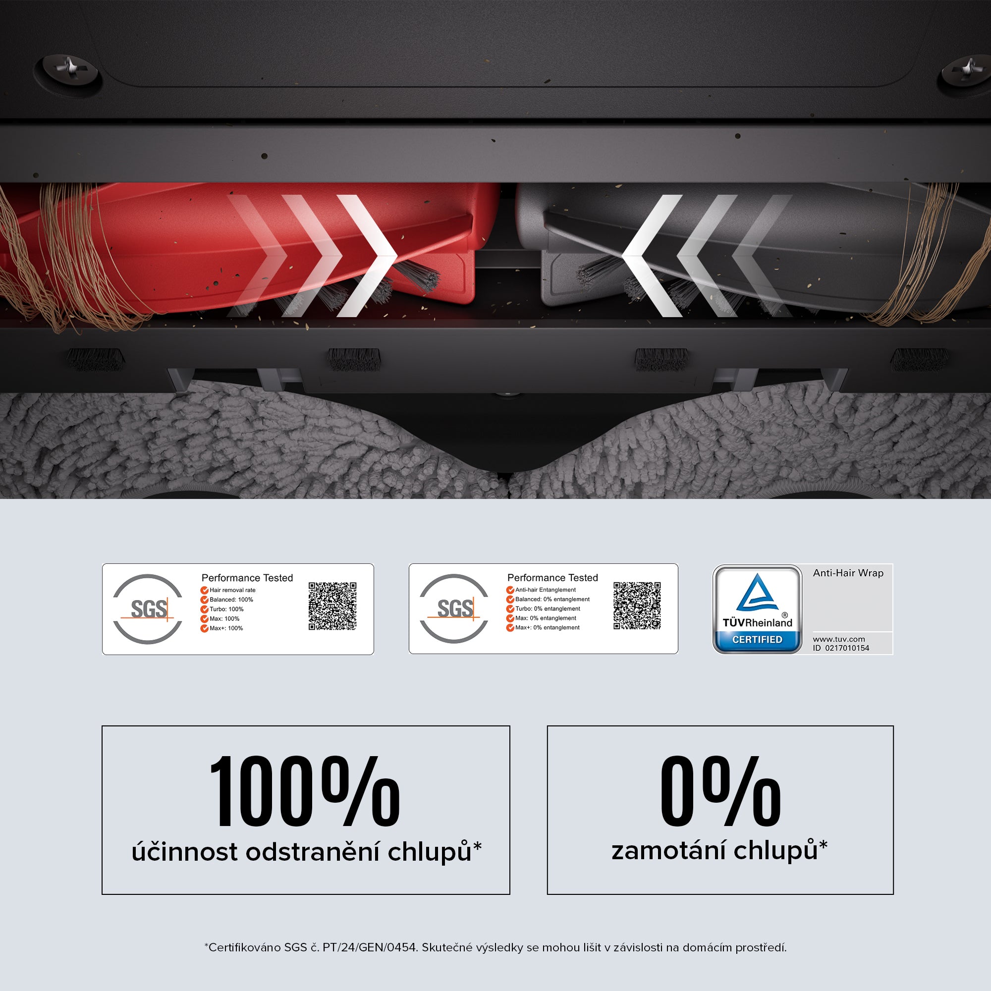 Zažijte dokonalé čištění s kartáči DuoDivide a bočním kartáčem. Je ideální pro domácnosti s dlouhými vlasy a domácími mazlíčky, má certifikát SGS a dosahuje 100% míry odstranění vlasů* ze všech typů podlah a 0% míry zamotání vlasů.