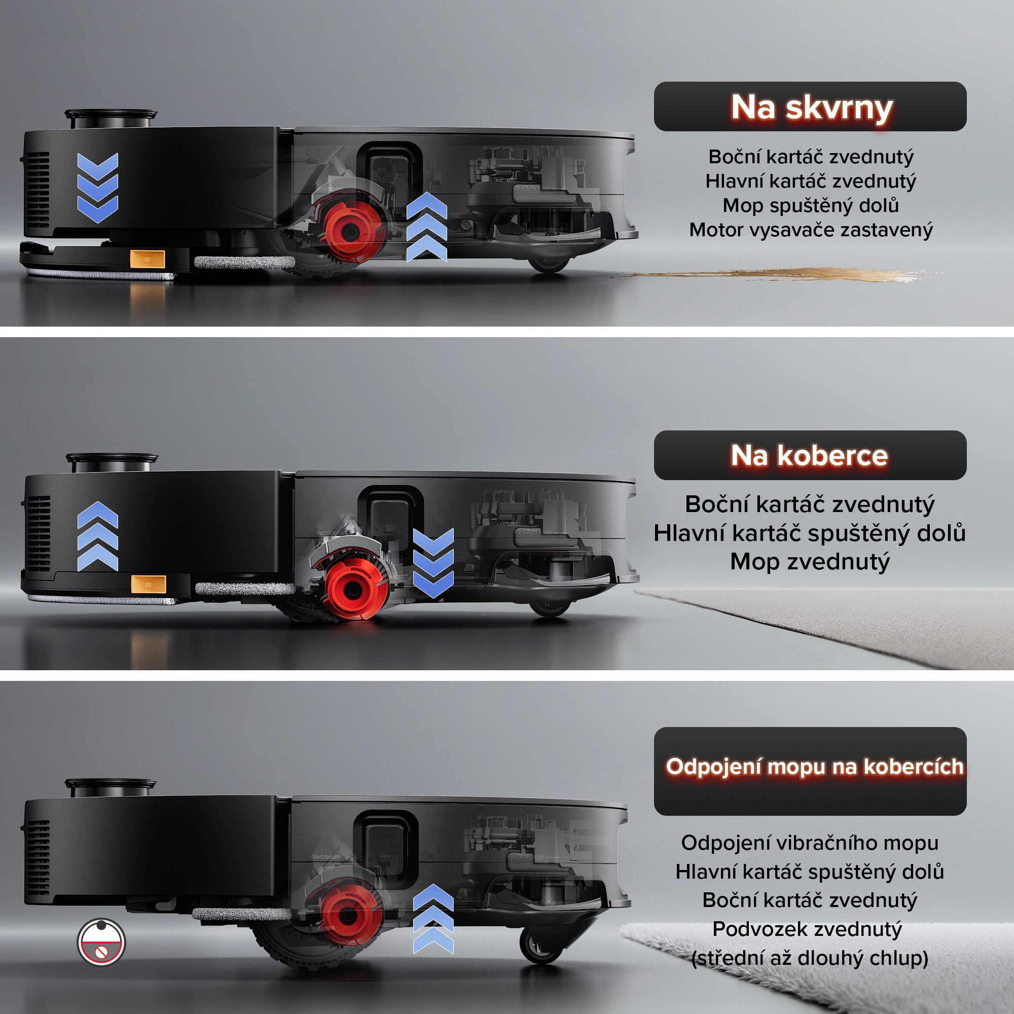 Adaptivní oddělení suchého a mokrého úklidu zajistí přesný úklid: boční kartáč, hlavní kartáč a prachový zásobník zůstávají suché, zatímco mop se vyhýbá koberci, aby se zabránilo riziku opětovného namočení.