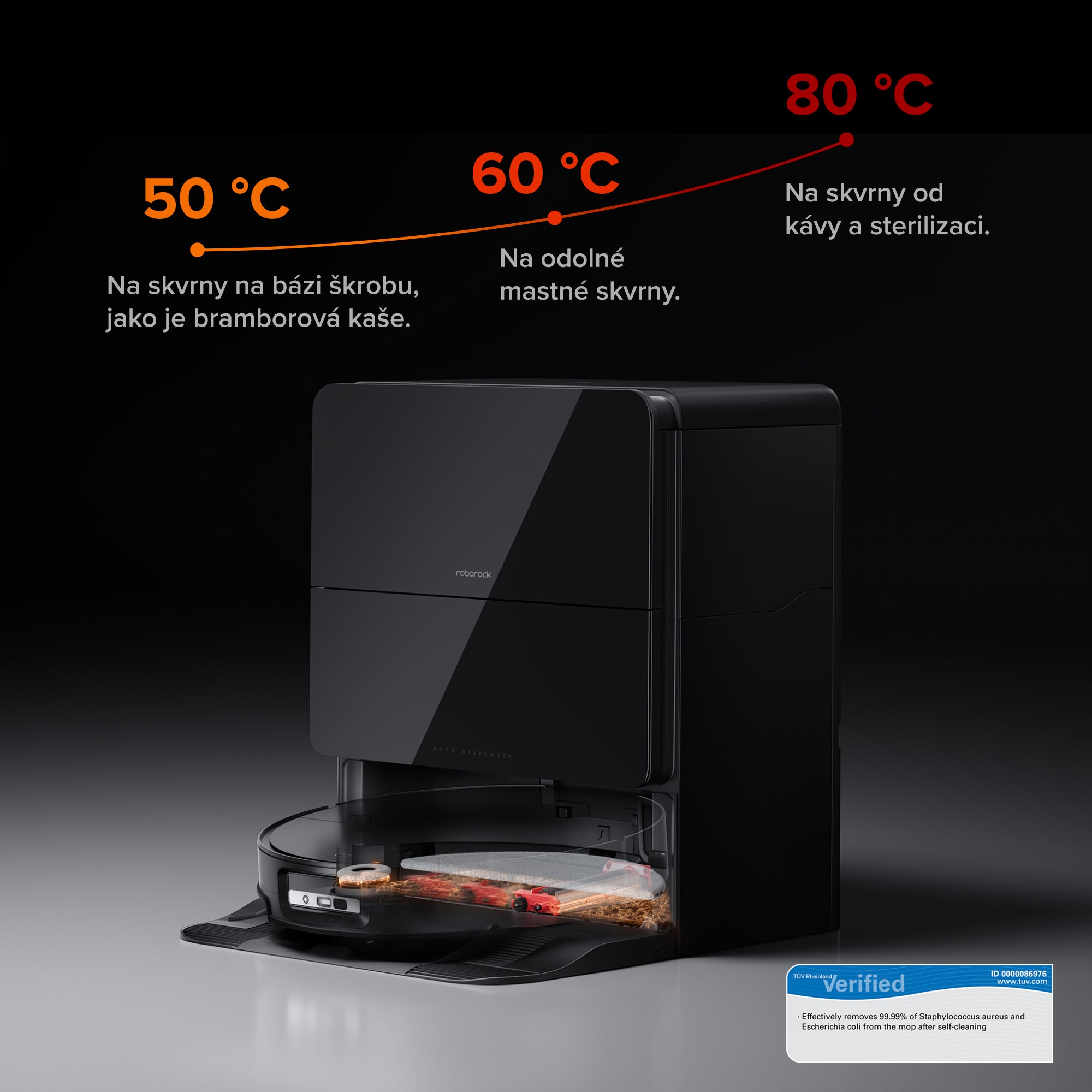 6. Na základě interního testování společnosti Roborock. Hladina hluku v tichém režimu mopování je testována na pouhých 52 dB(A). Hladina hluku během samovyprazdňování dokovací stanice byla testována na pouhých 72 dB(A). Skutečné výsledky se mohou lišit v závislosti na podmínkách použití.