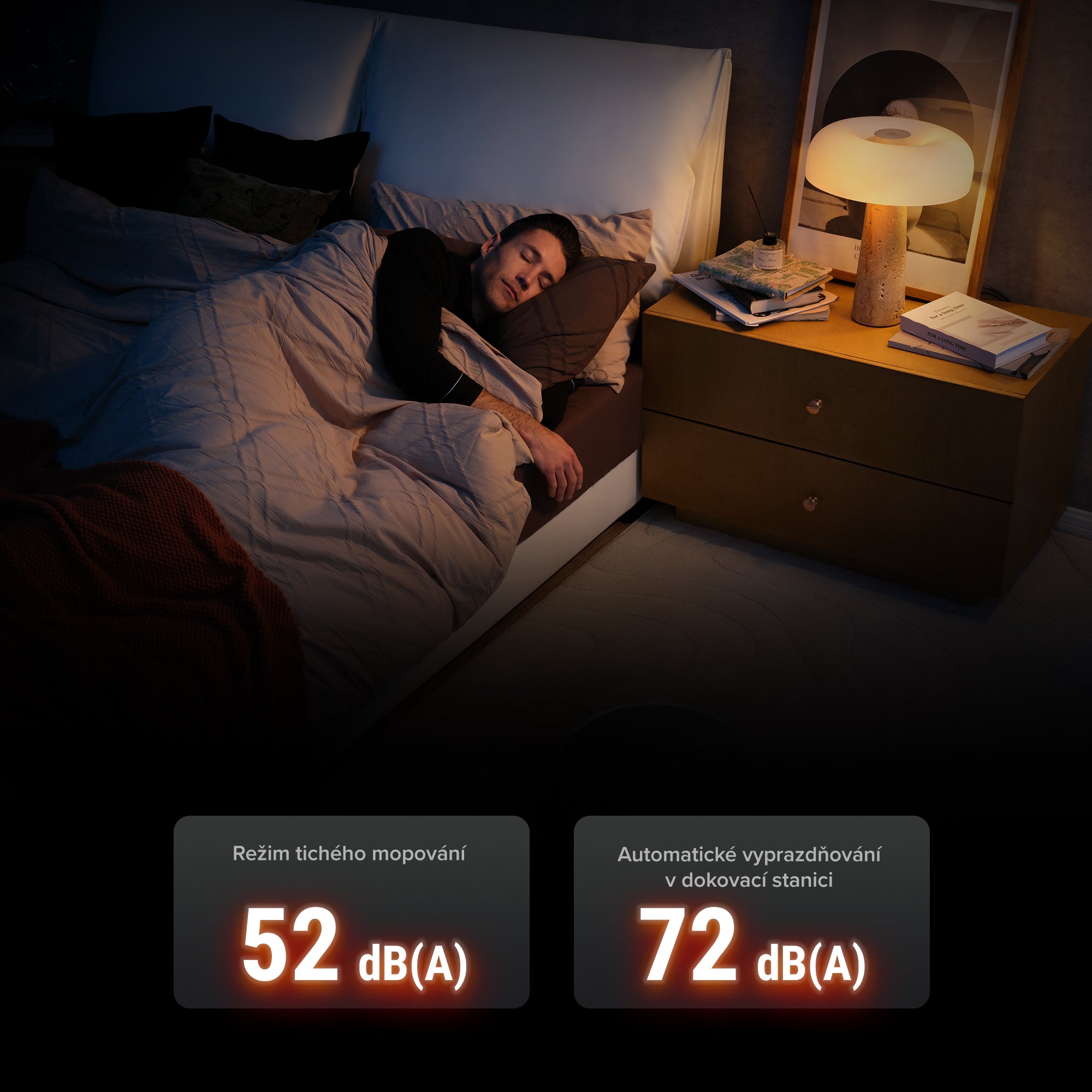 *Na základě interního testování společnosti Roborock. Při testování byla v režimu tichého mopování naměřena hlučnost pouhých 52 dB(A). Při testování byla při samočinném vyprazdňování v dokovací stanici naměřena hlučnost pouhých 72 dB(A). Skutečné výsledky se mohou lišit v závislosti na podmínkách použití.