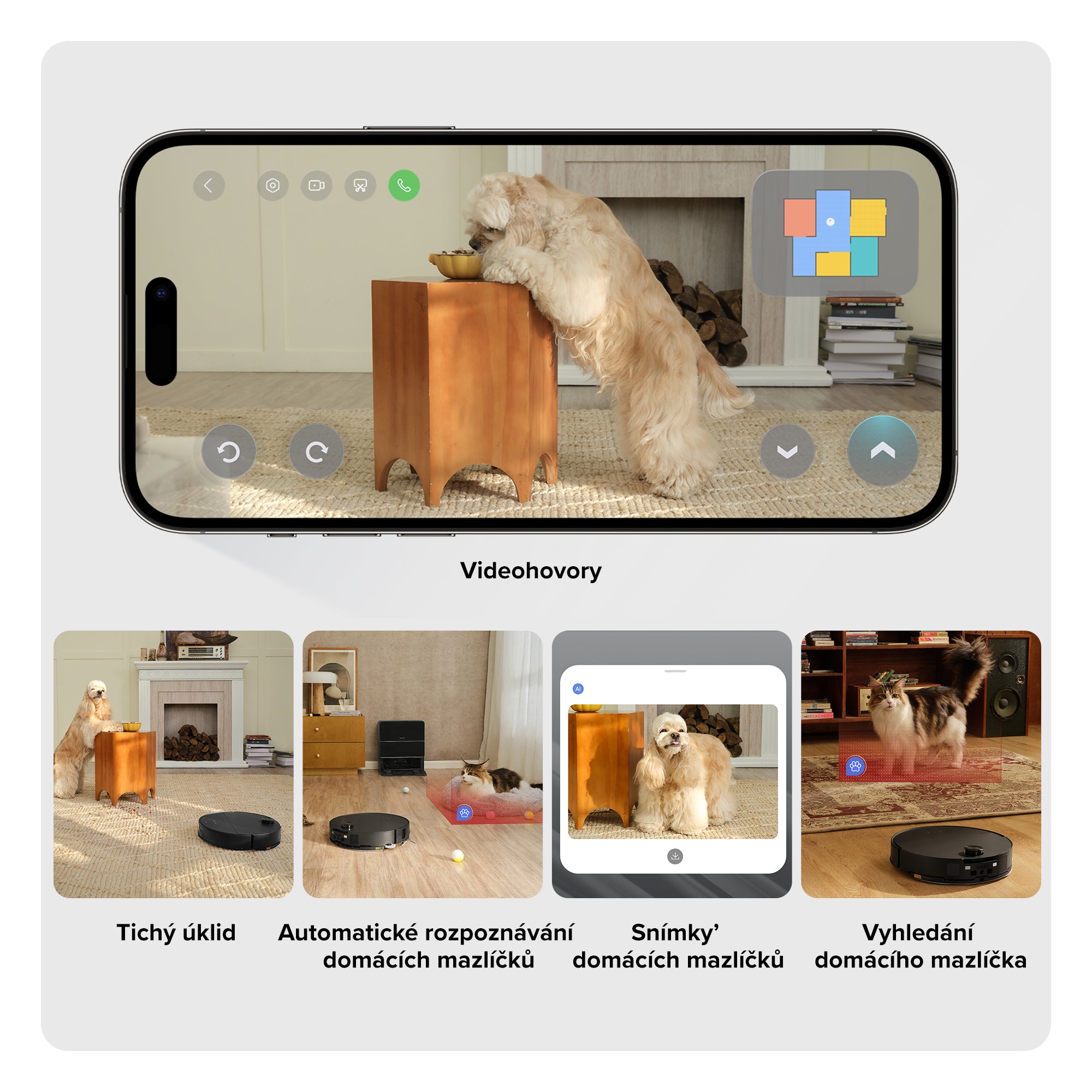 Funkce videohovoru, režim tichého úklidu, automatické rozpoznávání domácích mazlíčků, snímky domácích mazlíčků a vyhledání domácího mazlíčka společně zlepšují úroveň úklidu domácnosti a péče o vaše mazlíčky.